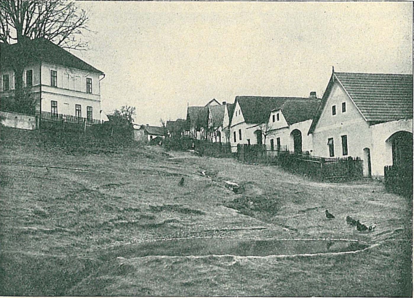 Celá vesnice je položena na značném svahu. Náves i nyní má podobný ráz. Zůstala málo zastavěná, jen v dolní části, v jihovýchodním boku, byla zúžena posunutím vrchnostenských budov do návsi. Plánek z r. 1829 i nynější vzhled návsi zdá se tomu nasvěd-čovati. V místech oněch pahrbků, na starém plánku zakreslených, stojí staré lípy a pod nimi socha sv. Jana. Na svazích mají nyní chalupníci své „jámy", sklípky pro brambory. Seskupení domů i s jejich detaily bylo sice zachováno, jen staré, roubené stavby ustoupily, většinou po požárech, stavbám zděným (obr. č. 14). Stará, malá škola byla nahrazena jednopatrovou budovou, stojící