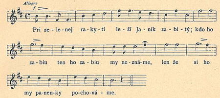3. Jeho věrná Mariška, oplakává Janíčka. »Zomrem od žial'u vďkeho, památajte, a potom ma k Janíkovi pochovajte.« —