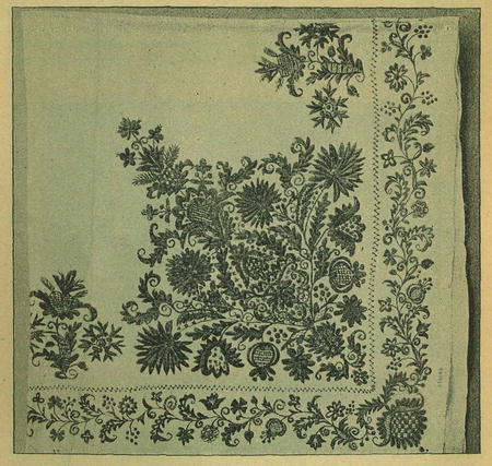 měla na mysli, když hedvábnou nití na látku je malovala. Pro lem vybírala si pravidlem motivy drobnější; u květů rohových střídají se menší kvítky s většími a massivnějšími. Nejsou-li rohy při lemu někdy šťastně řešeny, je samo rozvíjení lomu, vyrůstání stonků a květů a proplétání ratolístek vždy zdařile provedeno, v rozích pak ze srdéčka neb široce rozloženého kalichu vyrůstajíce, jsou kvítka a ratolesti