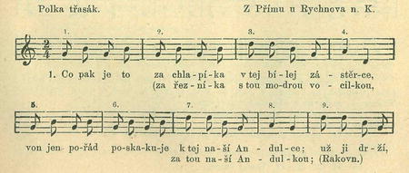 1 – 7. 8 – 14. (Obyčejně 8 párů do kola). Tanečník drže tanečnici za pravici vedle sebe, jakmile hudba začne, pustí ji před sebou do vnitř kola, kde ona. čilým pochodovým krokem postupuje směrem z leva na pravo, kdežto tanečník směrem svým přímo, z prava na levo, týmže krokem do kola jde proti ní. Což činí páry všechny. Když se tanečníci se svými tanečnicemi sejdou, vezmouce se po selsku tančí polku, až se zase tanec opakuje znova. (Taky mohou tanečníci jíti do kola a tanečnice postupovati z prava na levo).