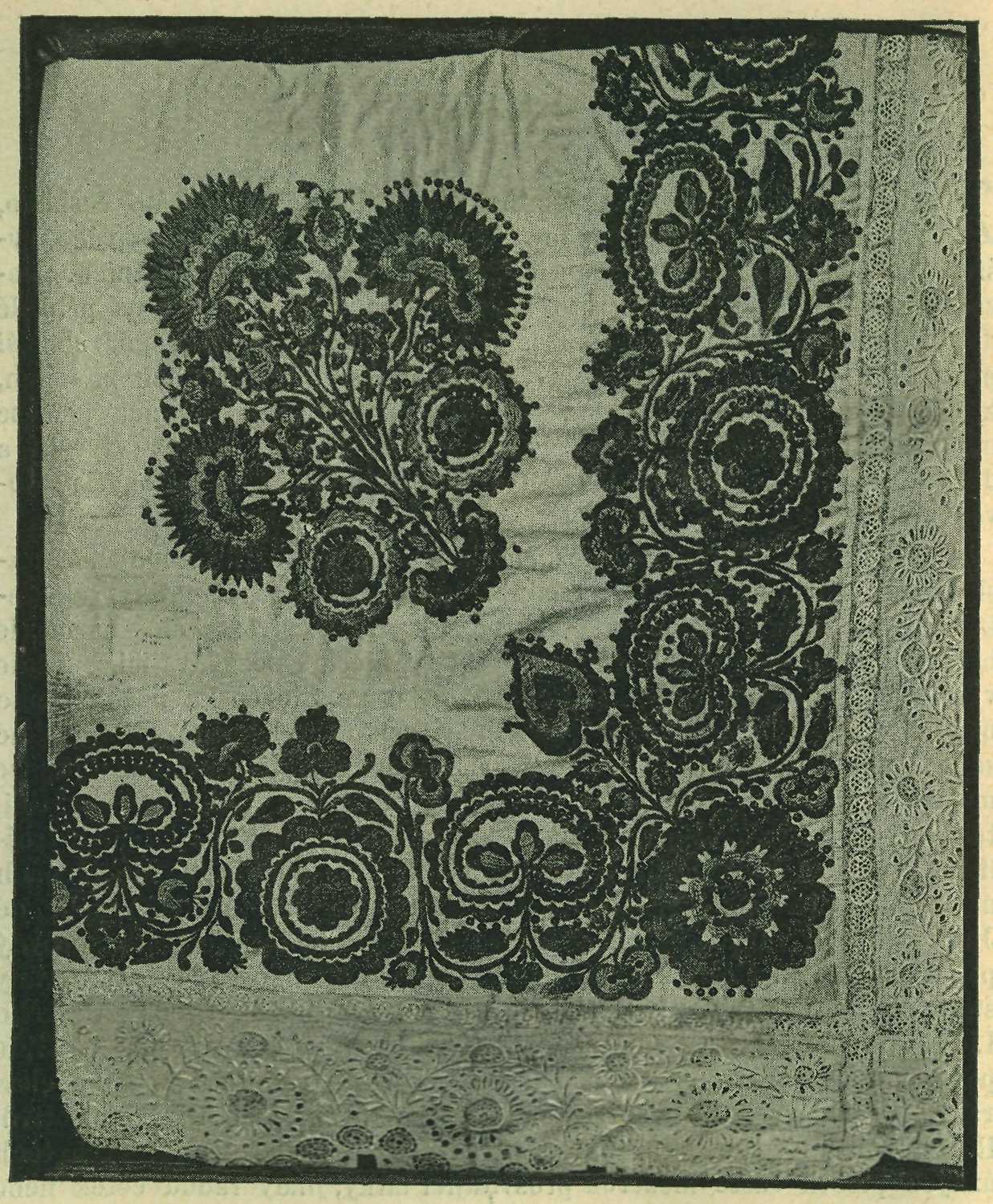 lesk hedvábí, často třpyt cetek a barevných bůstků, pak hustota vzoru, mezi nímž bílá plocha jen v malých partiích proniká, vylučují dis-harmonický a křiklavý dojem i při největší pestrosti sestavy barevné.