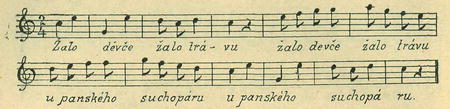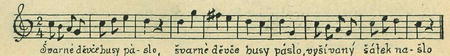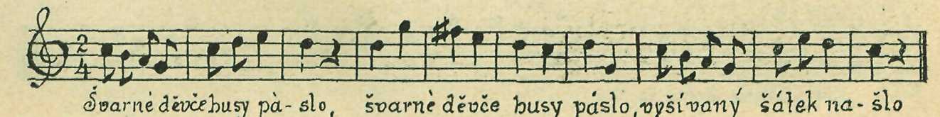 Stará melodie naše zanechala ovšem znatelné stopy své i v nápěvech písní, jejichž texty o žetí trávy nikterak nejednají. Z přečetných písní takových uvádím jen tyto dvě obsahem arci zase příbuzné: českou „Ovčák pase ovce" (EN. 493), jež upomíná právě tak na „Pěknou Káču", jako na „Osiřelo dítě", a k níž druží se moravské varianty (Sušil, str. 132, 133; Bartoš „Nár. p. mor." č. 81), a pak moravskou „Švarné děvče husy páslo" (Sušil str. 352), kteroužto poslední zde otiskuji, poněvadž zejména konec nápěvu jejího se zněním staročeským jest totožný: