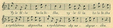 Ještě bližší jest nápěv jiný, který Erben sice otiskl se slovy „Vyletěla holubička" (EN. 750), na nějž však zpívá se také onen text „Žalo děvče (EP. 149), jakož i jiný ještě podobně začínající: „Šla má milá na travičku" (EP. 394):