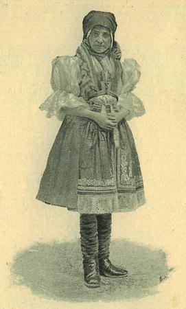 na modré půdě; dále pak přejemným vyšíváním zdobené z vesnic kopanických kol hranic uhersko - moravských u Javorníka. Na uherské straně patří k nejzajímavějším a nejstarobylejším zástěry vesničanek jihozápadně povážského Nového Města, nahoře při límci bohatě v úzké vrapy sbírané a v různých ornamentech přes tyto vrapy vyšívané.
