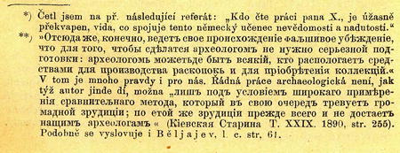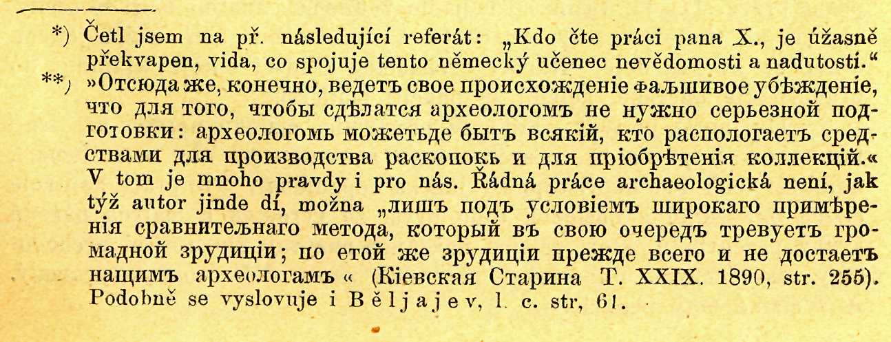 Podobné chyby zaviňují hlavně dilettanti v archaeologii. Dilettanti tohoto rázu jsou snad jinde nemožní. Jen v archaeologii se může státi, že statkář, na jehož pozemku se najde pohřebiště a jenž si z věcí nalezených založí hned doma museum, stane se tím samým již archaeologem a dá si titul tento i na svoji kartu. Zjev tento jest obecný, jak u nás, tak v Německu, ve Francii a jinde, a V. Z. Za-vitněvič vyslovil se nedávno týmž způsobem o valné části archaeo-logů ruských.**) Ovšem tito jednotliví národové jsou zase tak šťastni, že mezi množstvím archaeologů nalezne se přece řada lidí, kteří jsou odborníci skuteční, věc znající, kteří mnoho studovali.