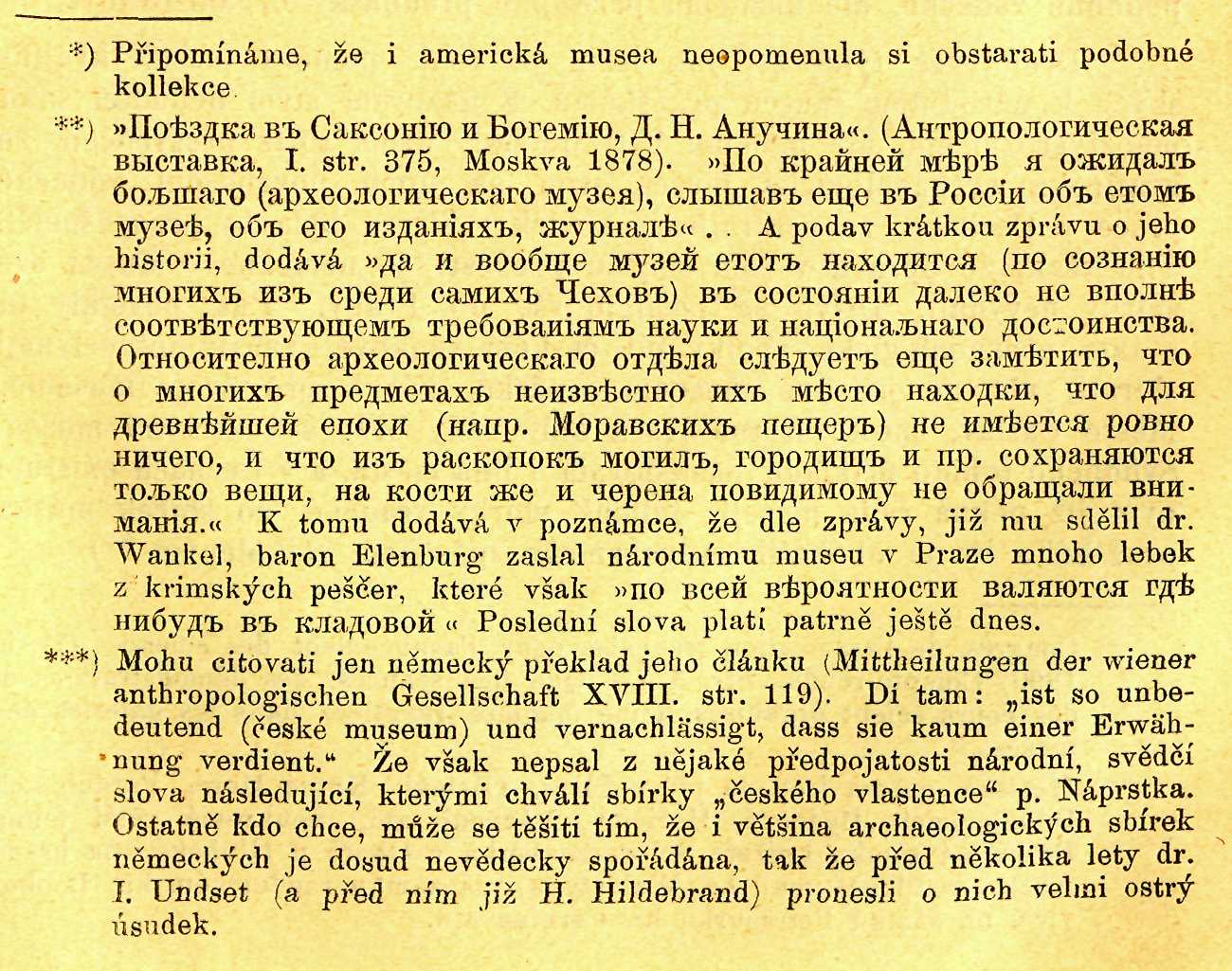 Jiný výrok, jehož jsme se dočetli, který bývalé organisaci našeho musea ještě menší chválu vzdává než zpráva prof. Anučina, pronesl dánský badatel Christian Bahnsson. Procestoval za účelem studií celou Evropu, viděl musea ve všech větších městech, ale žádné nebylo tak chatrné ceny jako české národní museum v Praze.***) O více soukromě pronesených úsudcích se nechceme zde zmiňovati.