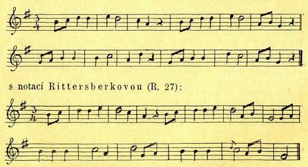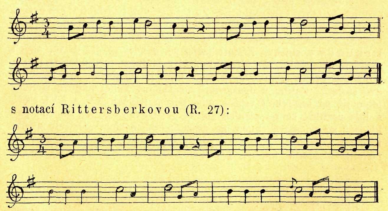 Co do melodie, ba i co do rozměru not oba nápěvy jsou přímo totožné; jenom úpravou taktovou a tudíž povahou rhythmickou od sebe velice podstatně se liší: u Erbena není předtaktí a často vyskytuje se onen češtině vlastní motiv s těžkou dobou krátkou a lehkou dlouhou, slovem nápěv celý má nejrozhodnější ráz český, kdežto u Rittersberka jednak předtaktí, jednak