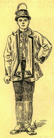 límcem (často cimbálem zvaným) opatřený; ten přechází pomocí výložků v užší přeložení látky po obou předních částech po celé jich délce až k dolnímu okraji.