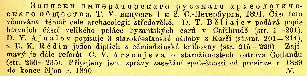 Viestnik hrvatskoga arkeologičkoga družtva. Godina XIII. Br. 1—4. Zagreb, 1891 Časopis tento, vycházející čtyřikrát do roka (cena 4 zl. redigován jest S. Ljubićem v Záhřebě. Přináší ponejvíce zprávy o hojných nálezech římských ostatků v Chorvatsku, Slavonsku a Dalmacii, články věnované epigrafii římské i staroslovanské, méně archaeologii praehistorické. V tomto ročníku zasluhuje z nich zmínky jen článek F r. Radice „Najnovija otkrića predhisto-ričkijeh predmeta u Drniškoj, Kninskoj i Vrličkoj okolici" (sir, 5—9, popis několika kamenných, bronzových a železných předmětů bez bližšího udání naleziště). V.