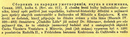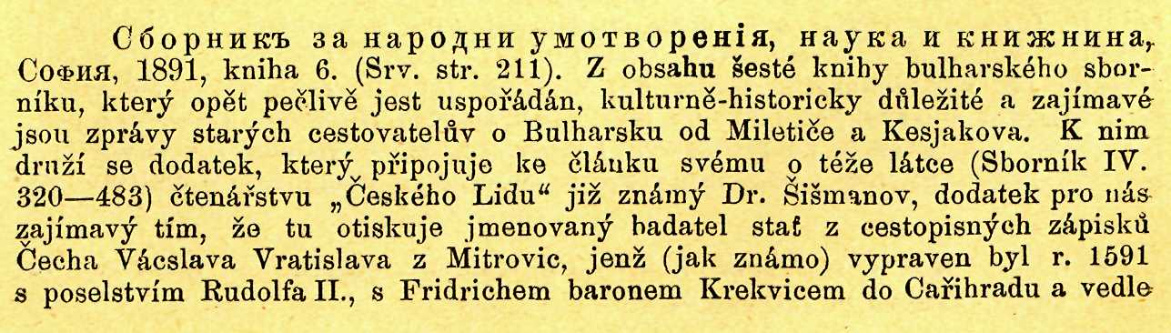 r. 1890" vypráví poutavě R. Krzywická o lidových hrách a zábavách v Rošci-szewě Z obrázku M Wawrzenieckého patrno, že český cep, jehož držák (polský „dzierźak" nebo „cepisko") spojen jest s bijákem (polsky „bijak") svorníkem (polsky, gazew"), provlečeným skrze ošití, podobá se úplně cepu polskému. Čarovné prostředky a léky proti psu vzteklému, které vypsal ze starých rukop. R. Łubicz, podobají se lékům českého lidu proti témuž, které Zíbrt otisknul v knize „Myslivecké pověry a čáry" (1889). Důkladná je bájeslovná stať Mik. Sumcova „Boginki — Mamuny", v níž autor se dovolává také českého bájesloví (divé ženy, skřítek). Wanda K . . . wiczova uveřejňuje pokračování zdařilého, plynného překladu Achelisowy knihy „Entwickelung der mod Ethnologie". Z knihy Stan. Polaczka chystané pro Bibl. Wisły „Wieś Rudawu" podána zajímavá ukázka lidového podání. Za statí J. Bogdauowiczówny „O lalkach" (loutkách, často podle víry lidové zhoubně působících u dětí, které si jimi hrají) následuje smíška materiálu lidovědného, upraveného a seřaděného podle otázek předchozích sešitů „Wisły (o lidovém léčebnictví, lidových názvech zvířat, názvech topografických [pěkný příspěvek Z. Wasilewského], ohních svatojanských a pod) Z četných referátů uvádíme posudek pěkné a důležité Mukovy knihy „Histor. und vergleich. Laut- und Formenlehre der Niedersrebischen" a podrob. obsahy odborných časopisů. Na konec jako vždy připojena veliká síla nejnovějších literárních zjevů ze všech literatur evropských. — Sešit 4. obsahuje poučnou ethnografickou stať W. Ronisze „Wieś Dreglin w Sierpckiem". W. Ma-tlakowski píše o velikonočních obyčejích, o pomlázce a oblévačce. Dokončení článku Nalkovského. S. Udziela líčí dožinky v Dobřechovů v Haliči. Nadějný a pilný pracovník S. Ciszewski podává ukázky svých výzkumů záhřebských, hlavně široce založený přehled „Folklorystika chorwacko-serbska". Překlad knihy Achelisovy dokončen. J. Sembrzycki: „Ziemie północne i zachodnie kraju źudwińskiego i ich granice." L. Krzywicki podává výsledky pozorování barvy očí a vlasů v určitých krajinách. S. Jastrzebowski vykládá o lidových názorech o životě záhrobném V části materiálové otištěno opět léčení lidové; Stan. Cercha pojednává o polské chatě s 2 půdorysy a 3. názornými obrázky; stať o kraslicích, o svatojanských ohních atd. Vše to provází red. Karłowicz vhodnými dodatky a vysvětlivkami. Týž v referátě o 1. čís. „Knih. Českého Lidu" podává zkazky polského lidu o skřítkovi. V bibliografické části kromě jiného upozorňuje R. Lubiez na stať Ad. Černého o germanisaci Lužice v „Národních Listech" (1891, čís. 278). Literárních novinek oznámena jest dlouhá řada, mezi nimi také knihy české. J. Karłowiczova zpráva o sjezdu orientalistův a folklo-ristů v Londýně. Zpráva o národopisné výstavě v Praze. Na konec otištěn životopis zesnulého J. Kopernického (srv. jeho nekrolog v sešitě 2., str. 215), psaný vřele od redaktora. Uveřejněny jsou tu listy znamenitého badatele k redaktorovi „Wisły". Z listu předposledního snad bude zajímati čtenáře „Č. L." tato lichotivá zmínka psaná krátce před smrtí od zvěčnělého Kopernického, váženého příznivce národopisného sborníka českého. „Od dr. L. Niederle otrzymałem tu list z zaproszeniem do wspólpracownictwa w nowem czasopismie „Č. L.", który maja, wydawać wspólnie z Č. Zibrtem. Program dobry. Cena bajeesnie nizka ."