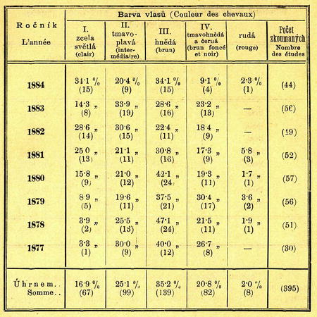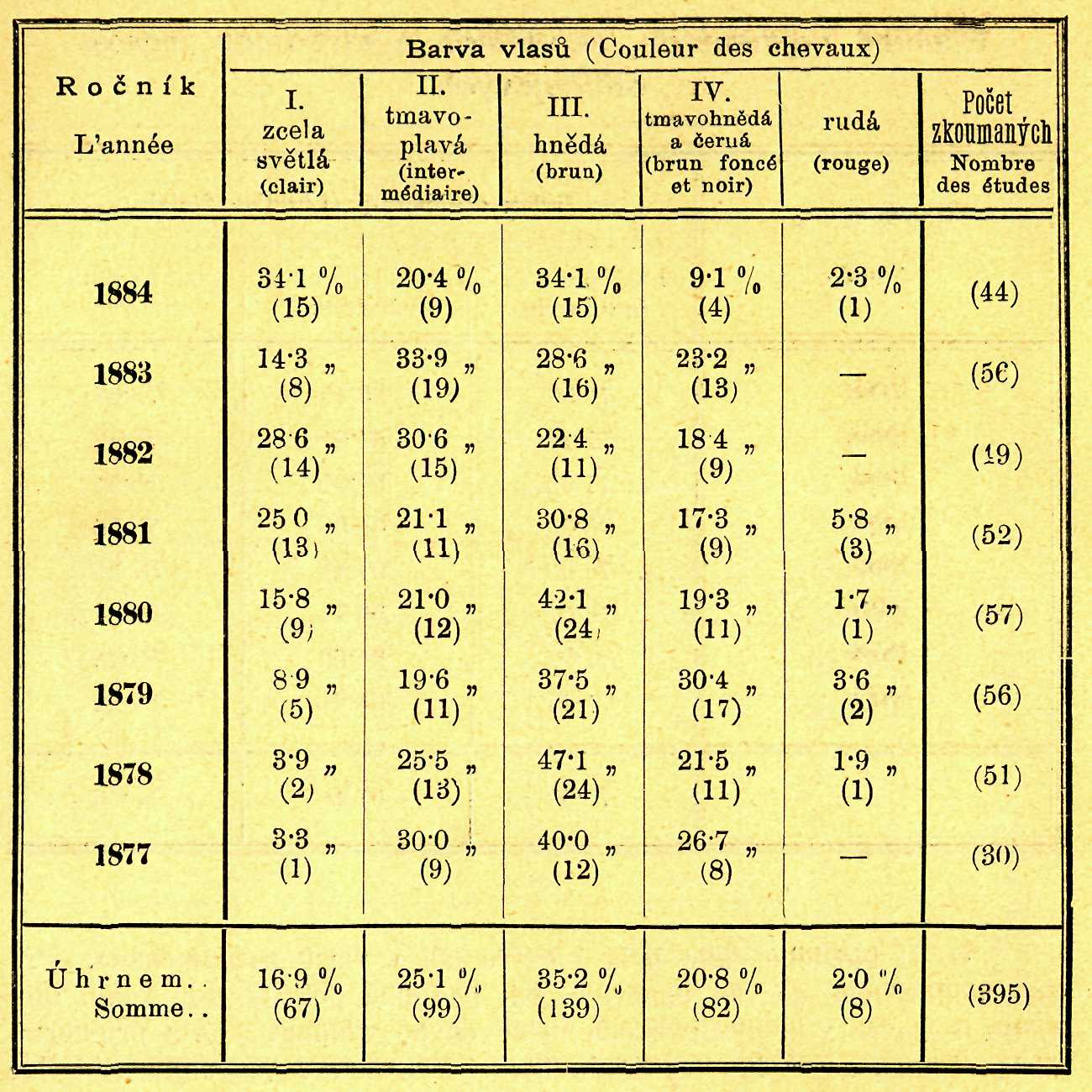 Z těchto přehledů vysvítá, že v školní mládeži lovosické jsou tmavší vlasy (III. a IV.) hojněji (56%) zastoupeny než světlejší (I. a II. — 42%), nejhojněji arciť hnědé III. (35.2°/o), nejřidčeji docela světlé (I. — 16.9%). Dále jest patrno, že nejsvětlejších vlasů od ročníku k ročníku ubývá, tmavohnědých a černých obráceně přibývá, slovem, že vlasy dětí při vzrůstu ztemní.