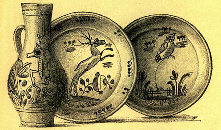 1653 a 1689, které zvláštní krásnou ornamentální kresbou národní, souladem barev a vkusnou formou vynikají. Tyto nádoby pokládají se za moravské. (Viz obr. čís. 1.)