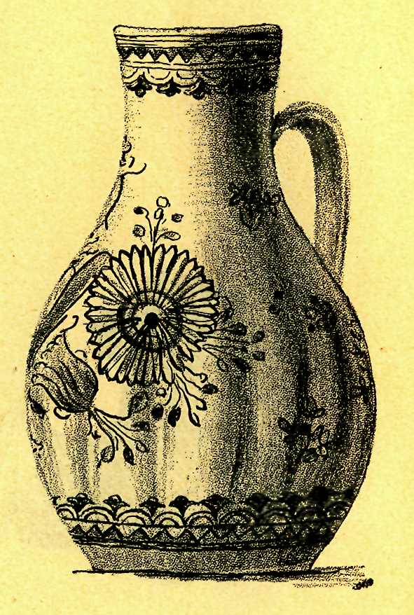 Prohlédneme-li si však výrobky nynějších venkovských hrnčířů, nemile se našeho oka dotknou nepěkné formy nádob, které jen sem tam ještě chudými vzorky neuměle jsou ozdobeny, ani zmínky o dřívější kresbě, ani potuchy o elegantní formě džbánkův a jiných nádob nenalezneme.