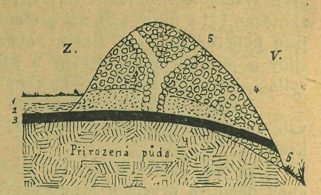 bok zevnější nesáhala (4), nad ni sledovala klenutě vrstva kamení, poněkud blinou promíchaného, sem tam páleného a 0,5 m. mohutného (5); nad ním spočívala opět vrstva uhlí po celém valu rozložená, 0,3 m. silná, na vnitřním boku valu příkře spadající, zvenčí však k patě valu nedosahujíc (6); pak sledovala vrstva do žlutá páleného písku porůzná hlinou pomíchaného (7), nad níž bylo rozloženo větší kamení pálené a spečené, celkem 1 m. v mohutnosti (8); v písčité vrstvě jakož hlavně i mezi škváry pozorovány byly stopy vzdušných rour, kterými se žár vzhůru bral.