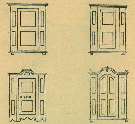 Také jarmara poskytovala výbornou příležitost k výzdobě malířské a právě od tohoto druhu nábytku máme nejpěknější kusy lidového umění. I zde jednalo se o zakrytí a zmírnění nepříjemného dojmu velikých ploch, kteráž úloha vznesena předem na geometr, rozdělení, a tu počínali si následovně: Plochy rozděleny po výšce na tři díly.