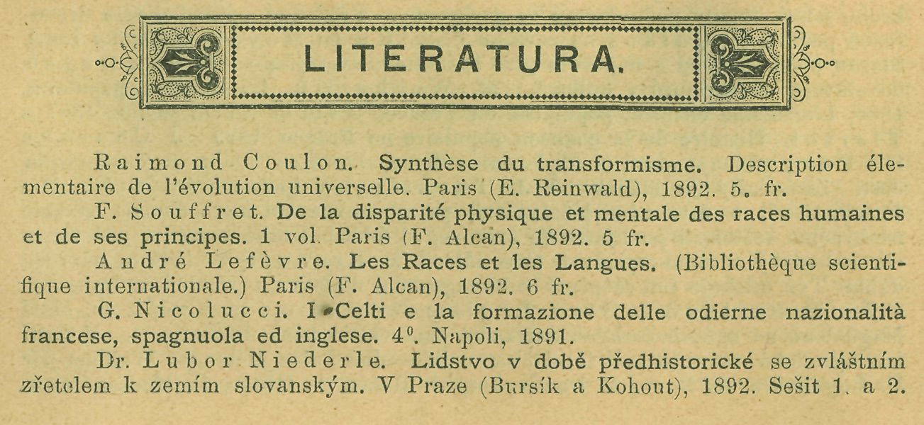 Simon, Liége, 1892 (o hrách, obyčejích, pověrách lidových) a A. Barth o knize Winternitzově. — Číslo srpnové: Zajímavý je článek redaktora G a i d o z a o lidových názvech ďábla. Pokračování pověr a obyčejů mysliveckých. Obřady při stavbách. Pokračování Tuchmannova článku o čarovném léčitelství. E. Ernault podává lidovou píseň z Bretagnska. De Charencey pokračuje ve zkazkách o dítěti, jež mluví v lůně mateřském. Z referátův uvádíme o knize: H. D'Arbois de Jubainville, L'épopée celtique en Irlande, I. Paris, 1892 a W. A. Clouston, Some Persian tales, Glasgow, 1892. — Předplatné na tento časopis, věnovaný studiu lidovědy a s obsahem bohatým, pečlivě řízený, ročně 12 fr. 50 – 10 mk. Adressa : Libraire E. Rolland, Paris, 2, rue des Chantiers.