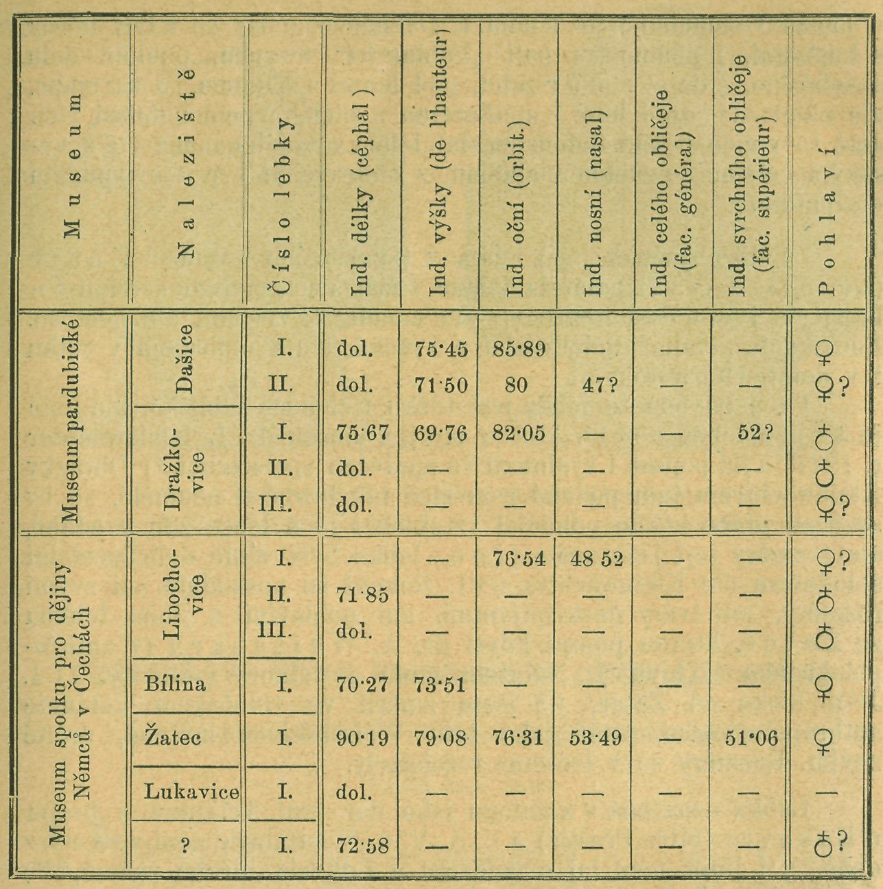 prostřední, čelo dosti na zad nakloněné. Náležela staršímu muži. Lebka III. (č. A. V. 9), jest rovněž velmi defektní. Schází jí celá levá část, a proto nebylo lze měřiti šířku; nicméně byla lebka jistě velmi dlouhá. Inion jest silné, taktéž glabella, nos vybíhající. Lebka náležela muži.