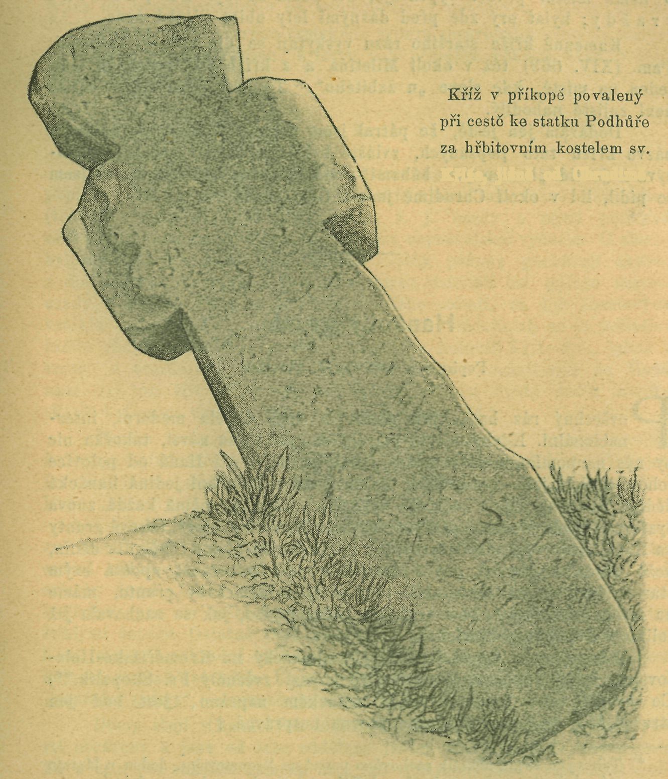 Kříž v příkope povalený při cestě ke statku Podhůře za hřbitovním kostelem sv. Kříže, jižně od Chrudimě.