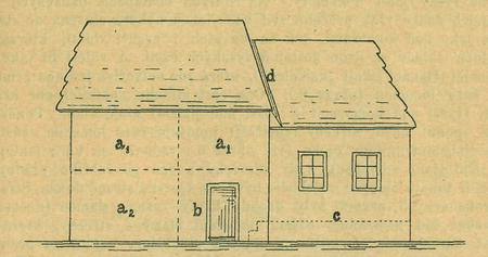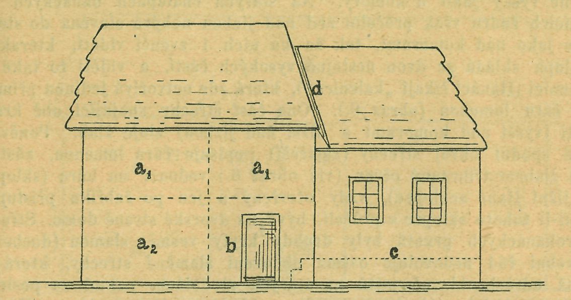 čís. 6. Znázornění konstrukce starohanácké chalupy bez žudru. a1 = horní komory, a2 = dolní komora, b = síň, c = podlaha jizby, d = žlab.