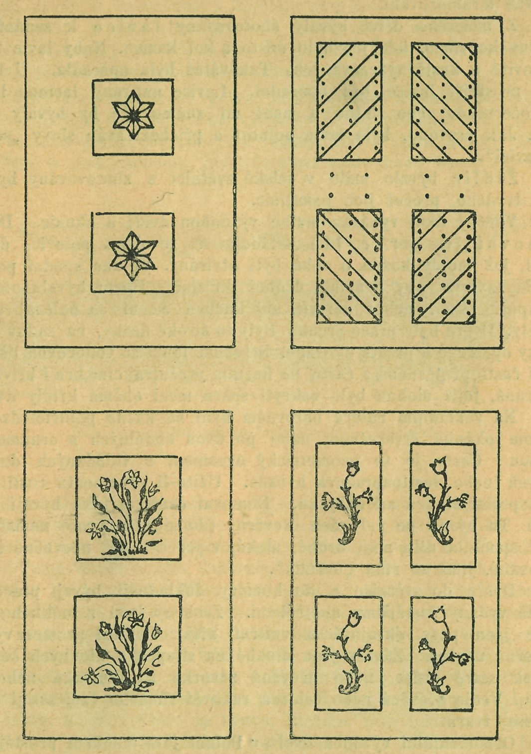 níků šikmými čarami souměrně jest vyčárkován, čím asi mají být vyznačeny pasy, z nichž náplně obdélné se skládají. Po obou stranách těchto šikmých čar jsou veliké bílé tečky, které znamenají hlavy