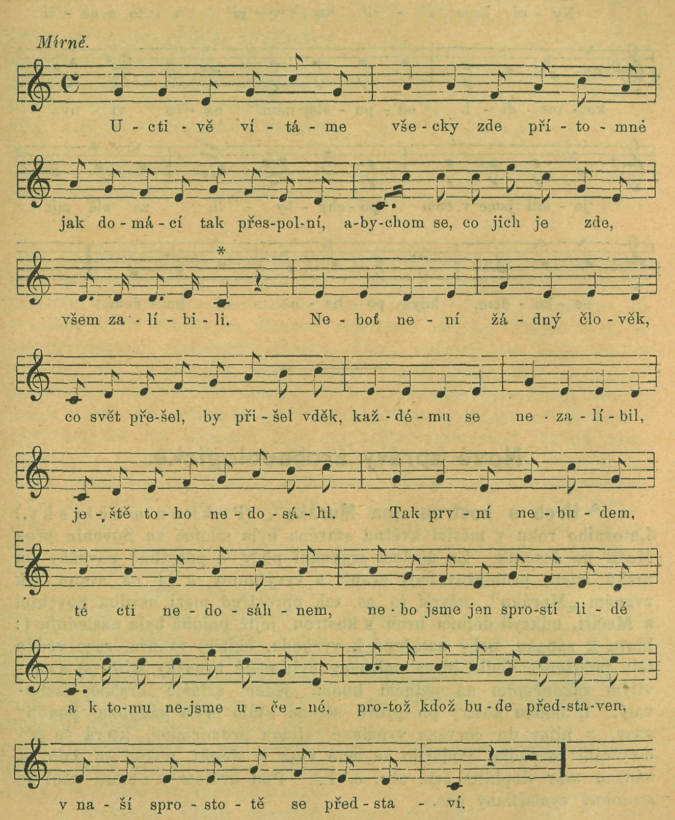 pohaněni budem. 2. Neb jsou tady mnozí lidi, / nejsou všichni v mysli stejný,/ mnozí sobě představují/to Františčino trápení,/jiní si nabrousí/jazyk na po mlouvání. /3 My jim ale odpouštíme,/jen když tu čest mít budeme,/to s hezkými mládencemi / trochu si potancovati, / my je chcem milovat / a lásku rozmnožovat.