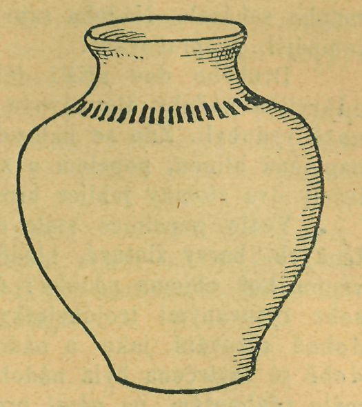 Střepy popelnice motykou rozkopnuté nebylo mně možno zceliti. mnoho jich scházelo. Z těch, které' jsem obdržel, zřejmo však bylo, že nádoba byla rozměrů velikých, silně baňatá, s poměrně úzkým otvorem. Spodní část vyrobena byla z hlíny hrubší, barvy okrové, vrchní pak z hlíny jemnější barvy šedé. Vrchní část byla též jemně uhlazena.