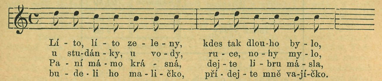 Na neděli smrtelnou z rána chodí malá děvčata dům od domu s „lite m". „Líto" jest smrková větvička ozdobená f&borečky, pentlemi, barevnými papíry, obrázky svatých a vyprázdněnými vejci čili vejdumky. Přede dveřmi pak zpívají : „Líto, líto zeleny, kdes tak dlouho bylo ? U studánky, u vody, ruce, nohy mylo. Jakej je to mazanec, bez koření, bez vajec? Panímámo, dejte pár vajec aby byl žlutší mazanec! Pochválen Pán Ježíš Kristus! Anebo zpívají: