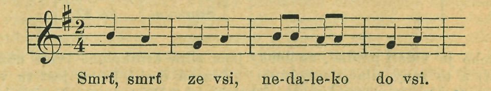 Na smrtelnou neděli chodí u nás chudé děti po vsi. Každé z nich nese „borovičku". Je to malá větvička z borovice a je na ní navěšeno barevných ostřižků a stužek. Kromě toho houpají se na ní „vejdumky", totiž skořápky ze slepicích vajec. Na vršku borovičky připevněna jest panenka bíle oblečená a ušitá z hadříků. Dítě postaví se v síni a zpívá: