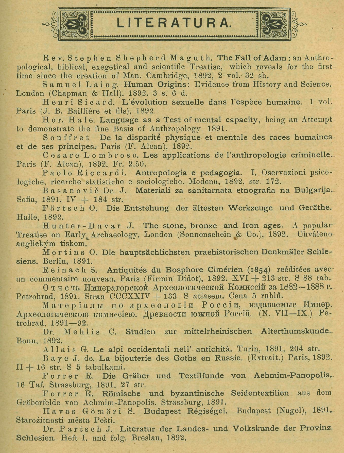 v Uhrách. Mich. Vrábely, O Rusínech v komitátu báčskéin. H. Wli-s 1 o c k i, Cikánské zažehnáváuí ohně. Kouzla cikánská při krádeži. P. Sróth,. Eumunská vira lidová z Marmaroše. F. G o n c z i, Charvatská ballada z Mtira-křize. Zprávy o literatuře cizí i domácí. Zprávy spolkové. Drobnosti. —b—