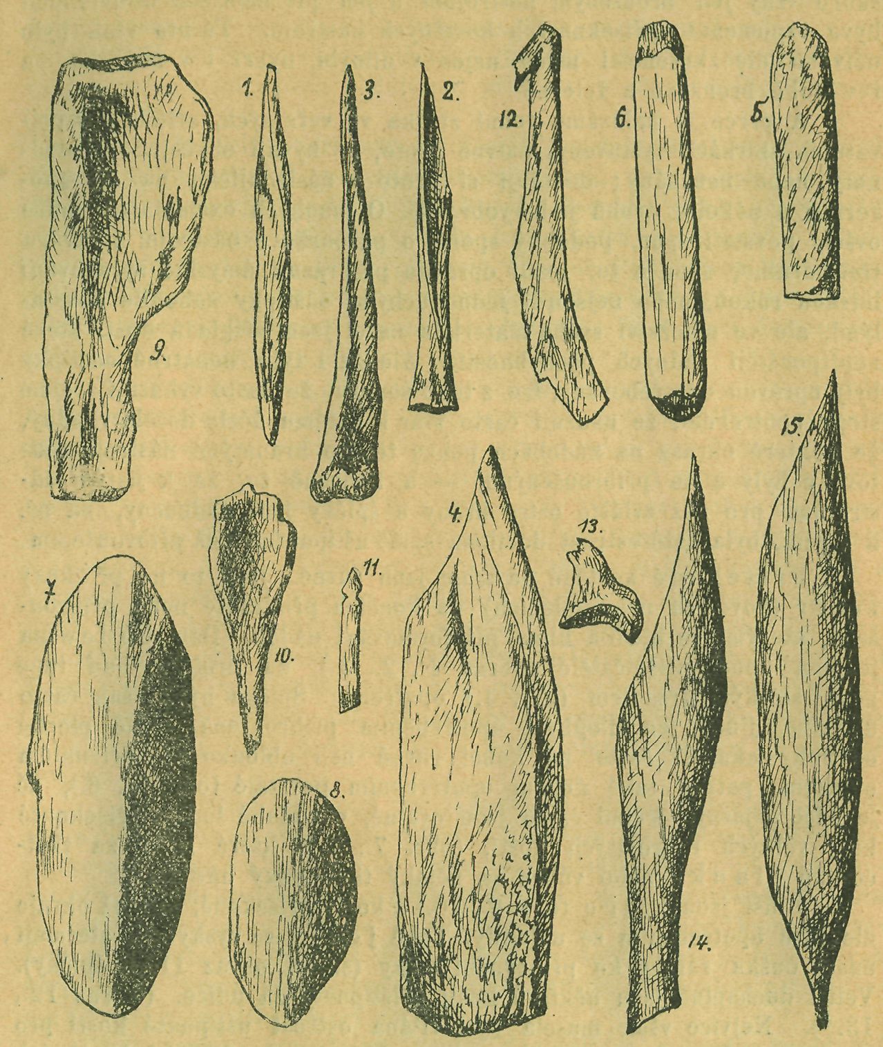 šených (ačkoliv podobných hrotů musel člověk do roka ohromné množství spotřebovati), poněvadž měl lacinější a přece úplně vyhovující materiál, totiž úštipky kostěné, kterých si však nyní při archaeolo-gických výzkamech zřídka všímáme. Prohlédneme-li však každou nalezenou i nepatrnou kůstku zvláště, budeme často překvapeni zřejmými známkami lidského spracování neb upotřebení.