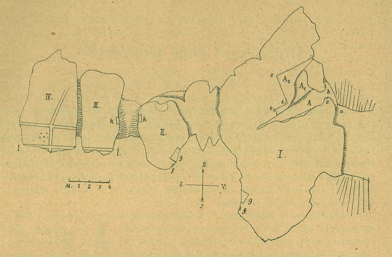 poznáme spod světničky (A), k níž přiléhá menší výklenek. Na třech stranách světnička zavírá se svislými stěnami, skloněnými k sobě v úhlech kosých, čtvrtá byla nejspíše sroubena z trámů, jakož dosvědčují dva protilehlé žlábky pravoúhlé (cc'). Ze spodu jen vyšší část mezi stěnami (A2) činí rovnou plochu, jí odpovídá na protější straně malý ústupek v téže výšce, střední prostora (A1) sklání se hrbolatě dolů k šíji. Eozměry stěn c1e = 4 m., ee1 = 3,90, e1e2 = 1,07.