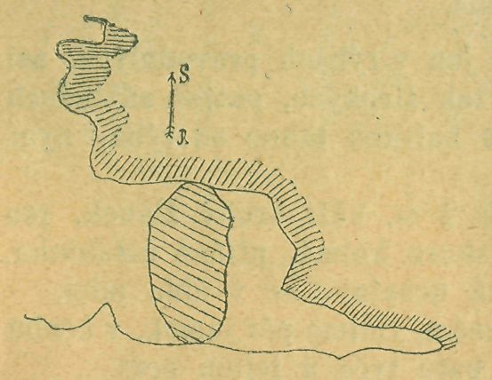 v zobákovitý hrot, trčící k východu, v kořeně hrotu vytesána jest jediná světnička, Drábovna. Nízký vchod na severní straně vede do prostory o 1m. nižší, ellipsovité, 5,30m. dlouhé, 2,5m. široké. Protilehlým čtyřhranným okénkem, otevřeným v kolmé vysoké stěně, lze přehlédnouti širý kruh Pojizeří. Ode vchodu níží se na levo skály a přecházejí v planinu.