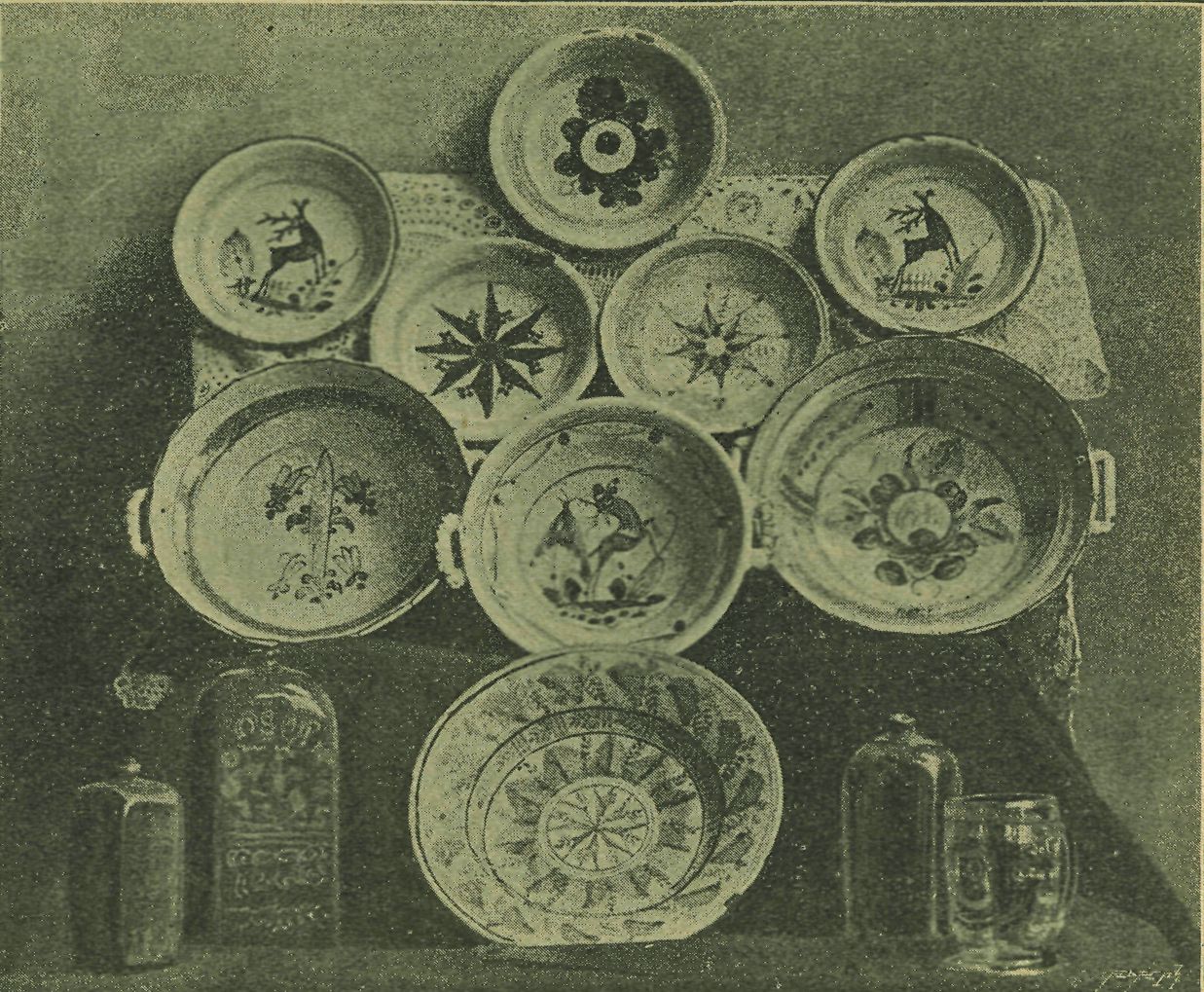 Poohlédněme se nyní po římse, jaké tam stará panímáma na Litomyšlsku měla nádobí. Ovšem možno tu promlouvati jen o nádobí ozdobném, jež se jako památka uchovávalo a jen za zvláštních příležitostí, krtin, posvícení („poscení"), svatby na stůl se neslo. O všedních svratácích, punclových hrncích, krajácích, miskách, o nezdobné dojačce, hrotku atd. netřeba mluviti. Také se zmiňujeme pouze o nádobí lidového a krajinského rázu. (Viz obr. č. 1.)