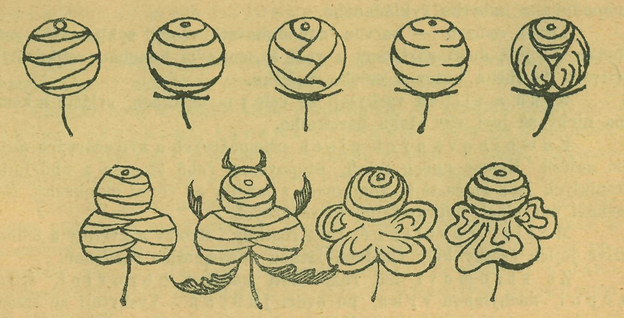 Dále pěkně stylisované květy karafiátu, konvalinky, pomněnky, lnu, máselníku a šalvěje nebo jiné rostliny téhož květu, kterých si hojně všímáno v zahradách i v přírodě pro léčivou jejich moc.
