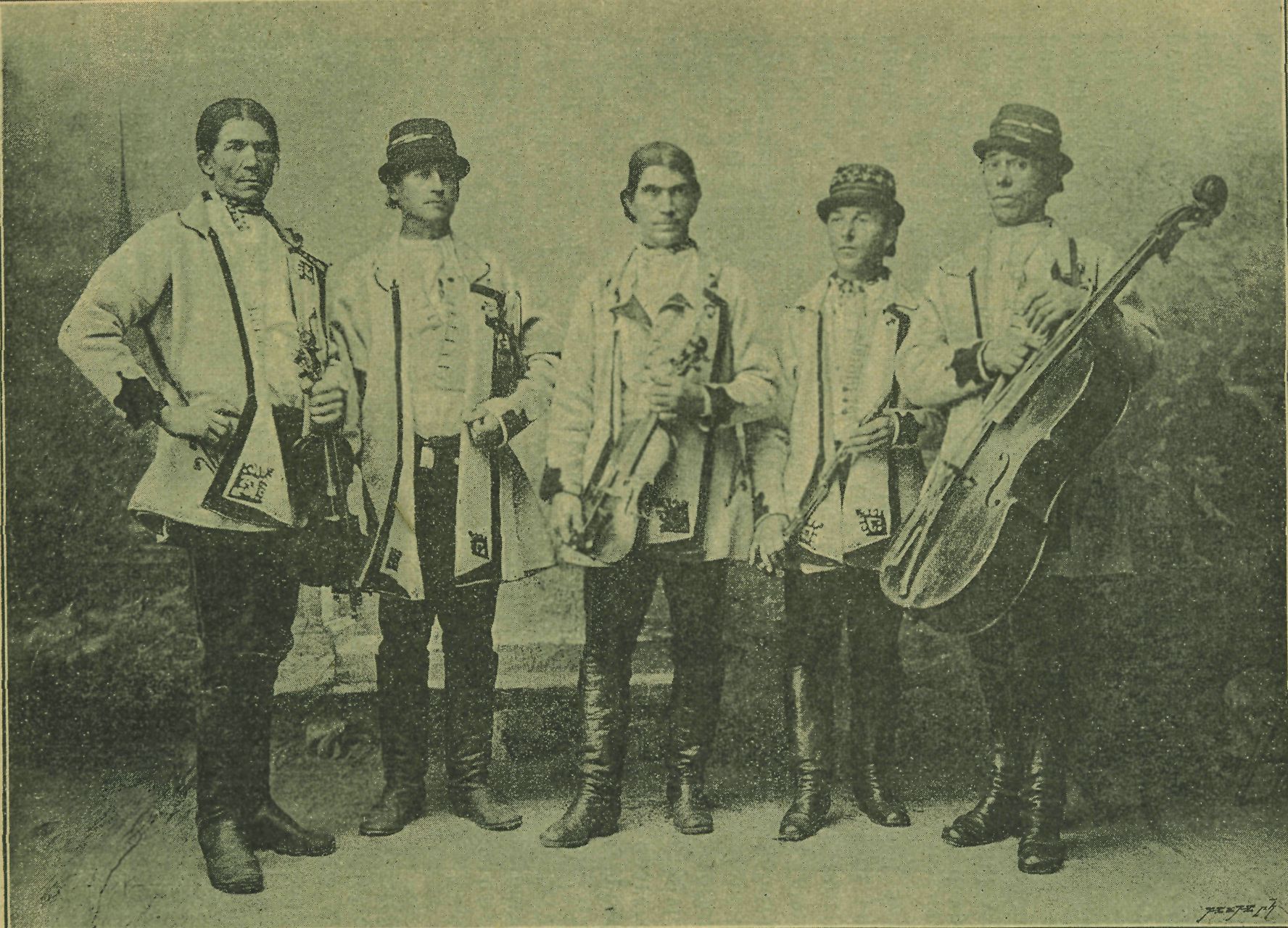 Skupina hudců z Velké vsi na Uherskohradišťsku na lidovém koncertě v Brně, 27. listopadu 1892. (Fotografie J. L. Šichana v Brně.)