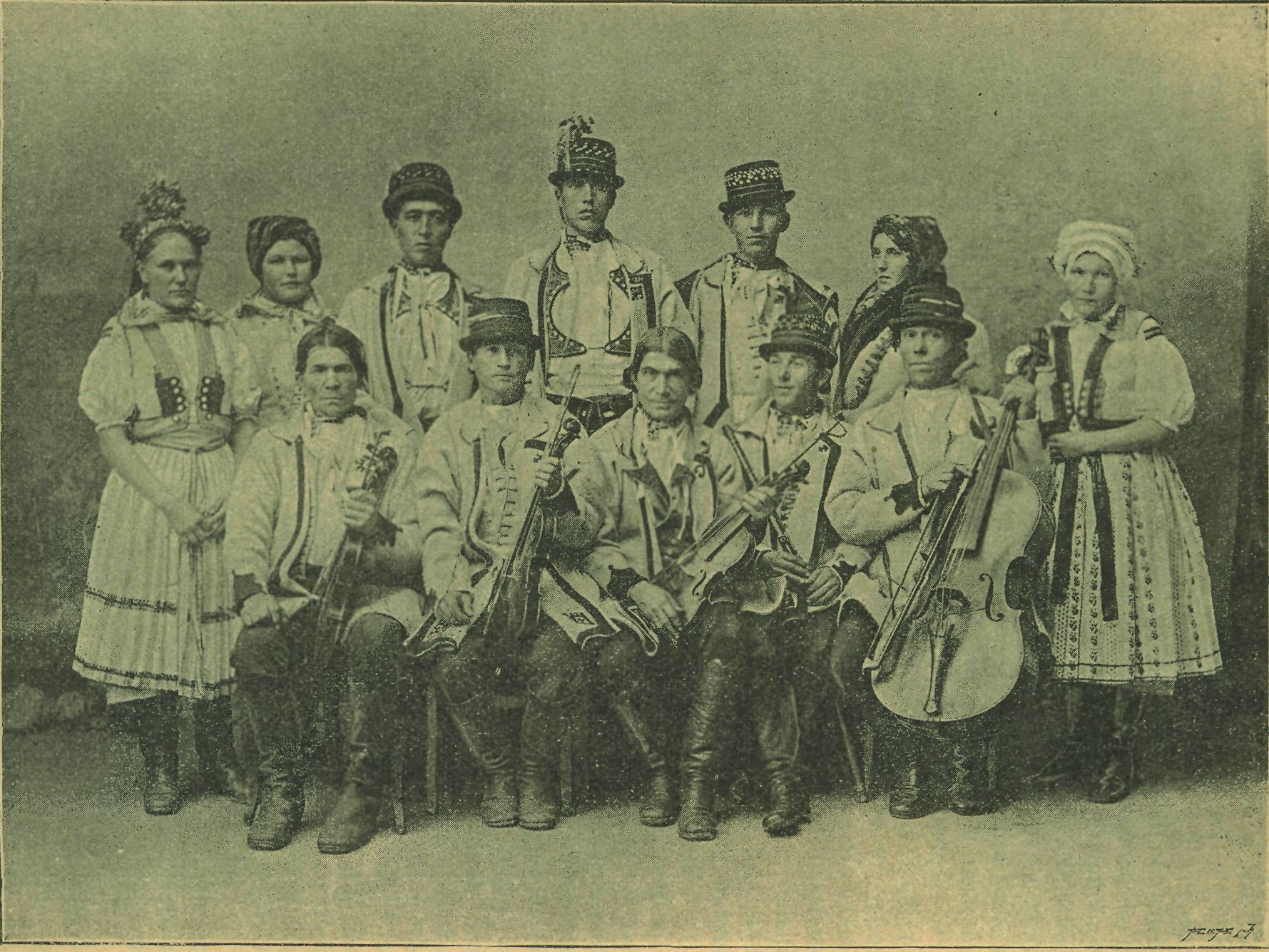 Hudci a tanečníci z Velké vsi na Uherskohradišťsku na lidovém koncertě v Brně, 27. listopadu 1892. (Fotografie J. L. Šichana v Brně.1