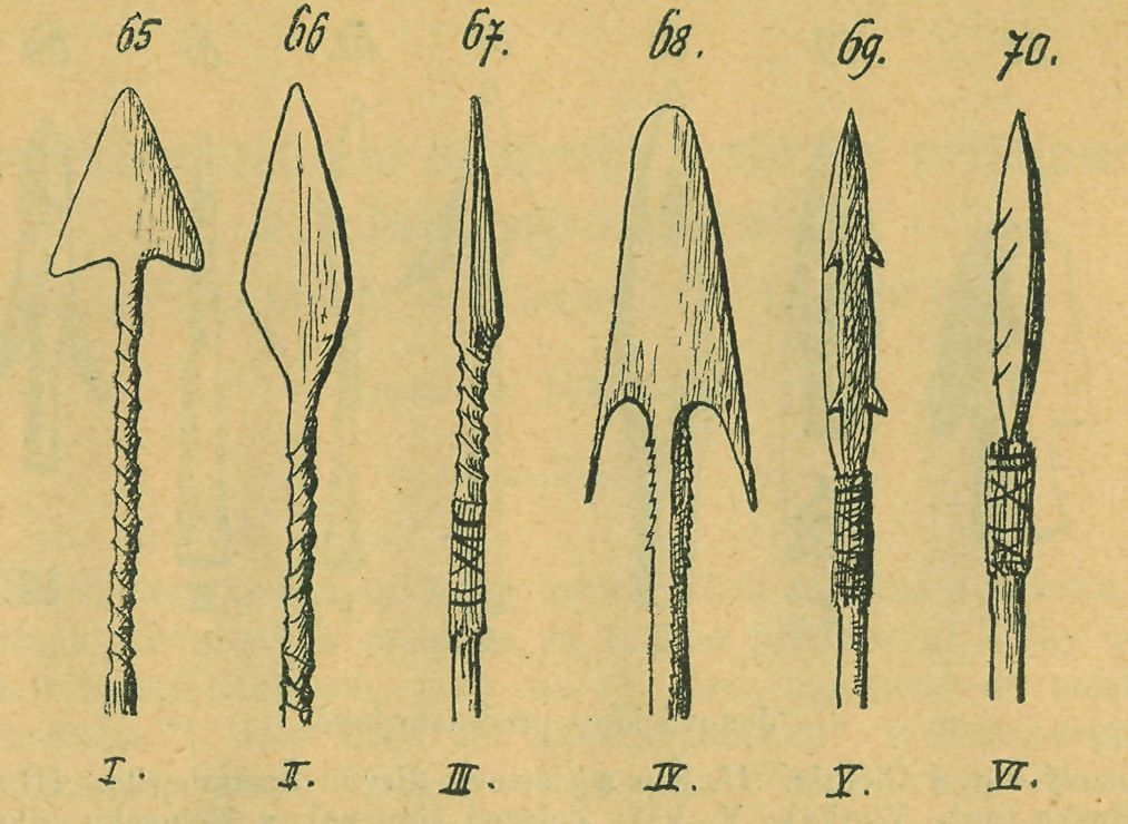 Podporou pro tuto domněnku jest mi to, že i nynější divoši docela podobně si počínají. — Na jihoafrické výstavě dra. Holuba měli jsme příležitost viděti jedem napuštěné hroty Ma-n'Kojů, které pod křídly ukazovaly docela stejné, kroucené (obr. 65. a 66.), jako ony předhistorické šípy, anebo různě zhotovené zářezy (obr. 68.), což oboje jest docela způsobilé jedovatou hmotu lépe zadržeti. Podobné