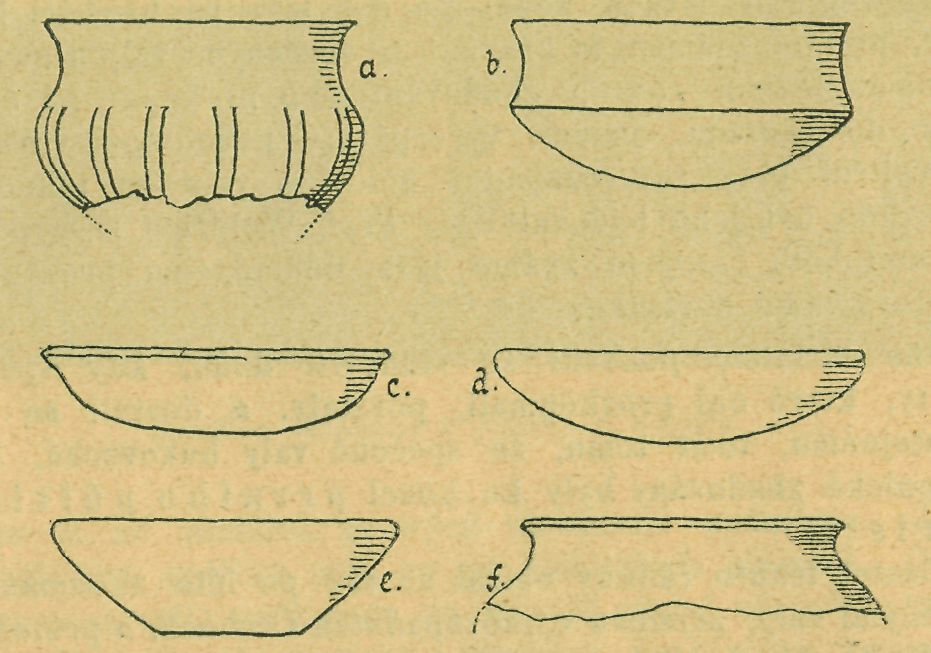 Naproti tomu neobsahuje spodní část vrstvy kulturní nic takového. Hojné střepy, které v části této se vyskytují, pocházejí vesměs z nádob rukou hnětených, oušky a pupíky opatřených, barvou (červenou) potřených anebo výkresy grafitem malovanými (zvláště na vnitřní straně) ozdobených, nebo obroučkami důJkovanými pod hrdlem