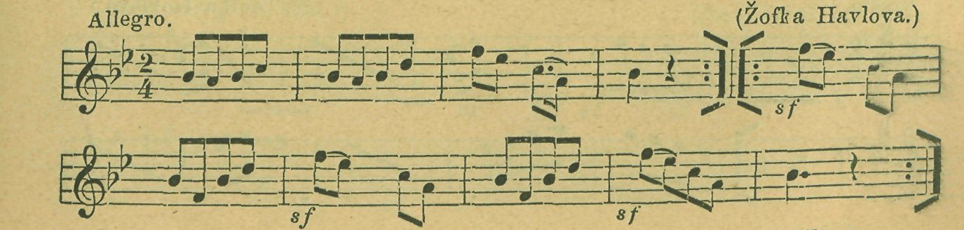 Když jsem se tázal při „Požehnaném" co hrají, když se déle tentýž tanec křepčí, pravil mi jeden z hudebníků: „přehazujem do jiného tonu". Tímto „přehazováním" vzniká jednak úsečný způsob modulace tóninové, jednak jsou tyto „přehozené tóny" vlastně imitací (popěvem) původního znění. O celkové osnově můžeme pak říci, že jest slohu zálohového (thematického) naproti rhapsodickému slohu Starodávných.