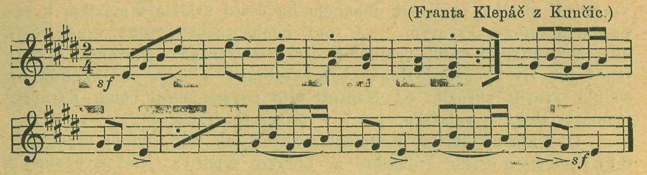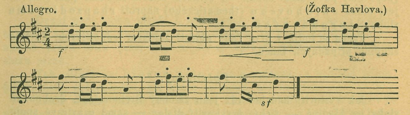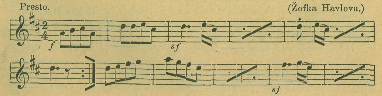 Čtyřikrát se opakuje drobounký nápěvek na jadrném basu: výtečná to protiva prvému dílu s úseoným rytmem. Celek jest zajímavý prvek formový, marně po jeho vzorci hledáme v dočasných naukách. Též útvar písňový — ale s tím rázem nepotkáme se u cizích skladatelů; proto jest i u nás a pro nás zvláštností a ne pravidlem. Pozdější následek toho bývá, že slýcháváme Schuhmanna, Wagnera, Mendelsohna atd. ve stém vydání i v českých skladbách. Rychlost = 138.
