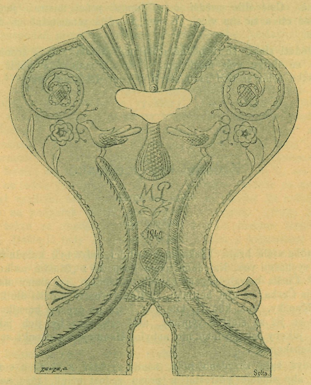 kované závitnice končící kytičkami s dvakráte rýhovanými čtverečky uvnitř, růžice s vrbovými lístky, ptáčkové s jahodovou ratolístkou v zobáčku, srdce, krajky kolem obrysu židle, jakož i dvě pěkné porty s třepeníčkem uprostřed opěradla (připomínající zadní porty na bílém kožiše s tulipánem) jsou zajisté rázovitou ornamen-