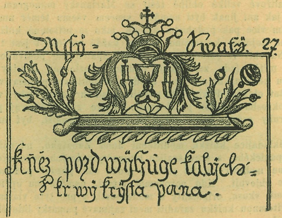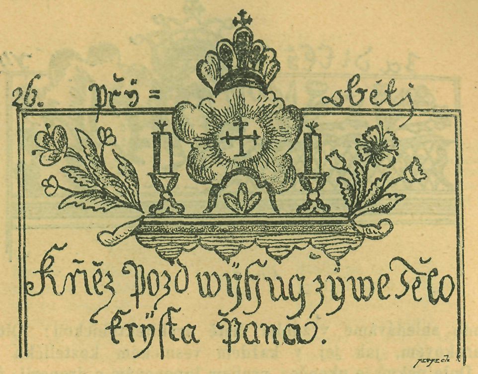 filu). Celek doplňuje motivy ornamentiky národní, zvláště rostlinnými. Spoře používá ornamentu měřického. Kombinuje všecky dle potřeby. Snahu illustrační provádí se zdarem, a kdekoliv otevřeme knížku, bez rozpaků poznáme obsah slovný nebo shledáme obrázek zcela případný. Dovoluji si na př. poukázati k modlitbě za úrodu zemskou, kde pěkně znázornil vinici, pole, zahradu, počasí slunné i mračné i pevný sklep. (Obr. 2)