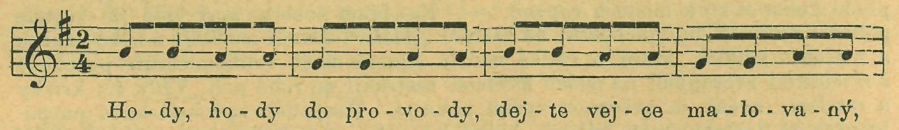 nedáte-li malovaný, dejte aspoň bílý, slepička vám snese jiný. Za kamny v koutku, na vrbovém proutku, proutek se ohýbá, vajíčko se kolíbá, slepička vdák! vajíčko křáp! panímámo, máte mi ho dát!