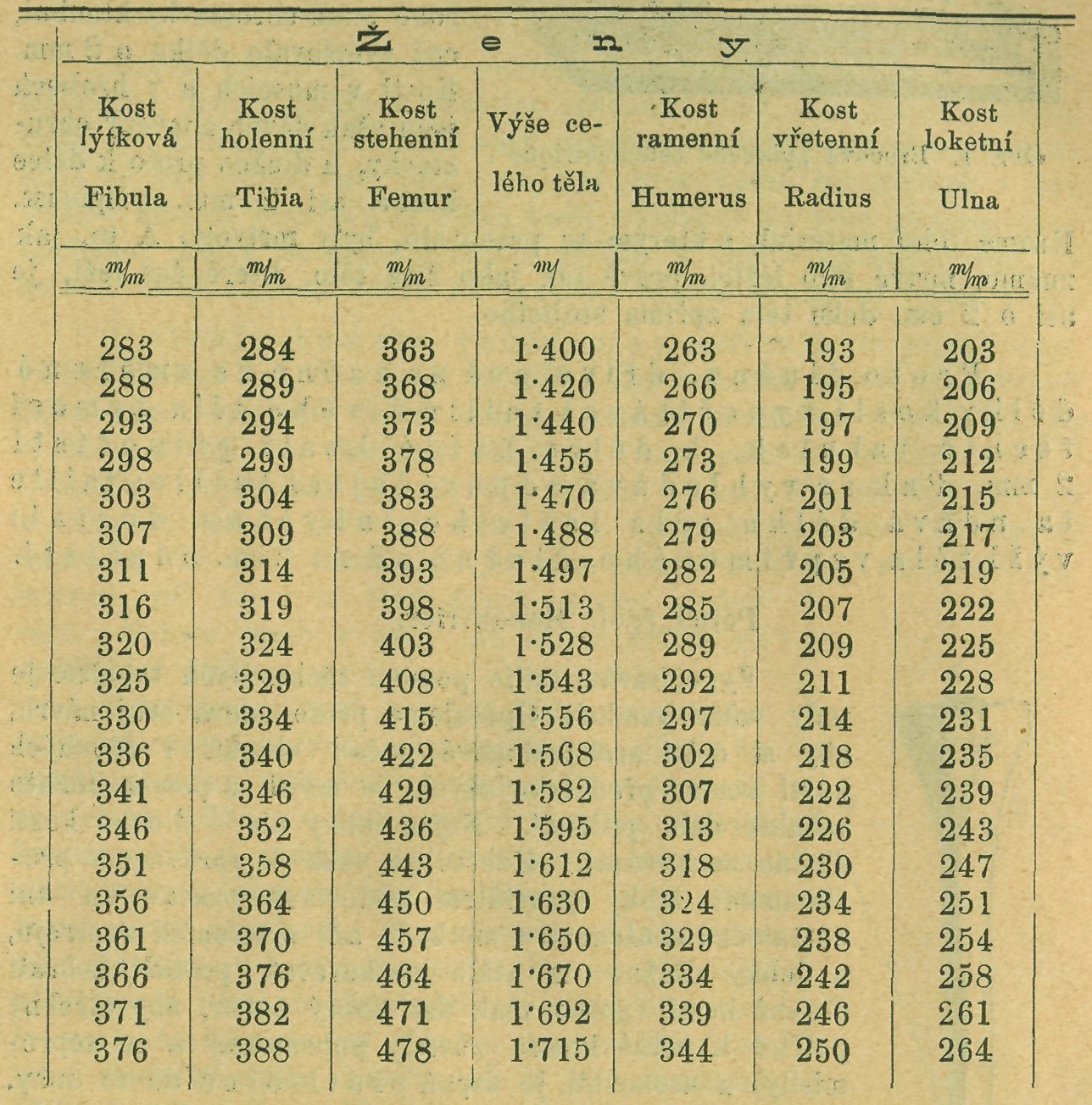 *) K vypočítávání mužské taille z délky kostí menších než jsou minima na tabulee slouží násobení nalezené míry koeficientem 4-82 (u fibule), 4'80 (u tibie), 392 (u femuru), 5'25 (u humeru), 7-11 (u radiu) a 6'66 (u ulny). Pro ženské kosti v téiaže pořadu platí koeffieienty 4'88, 4'85, 3"87, 541, 7-44, 7-00. K vypočítání taille z délky kostí větších než jsou maxima na tabulce slouží koeffieienty 4-37, 4-32, 3-53, 4-93, 6'7O, 6"26 pro muže, coefficienty 4-52, 4-42, 3 58, 4 93, 7 00, 6-49 pro ženy.