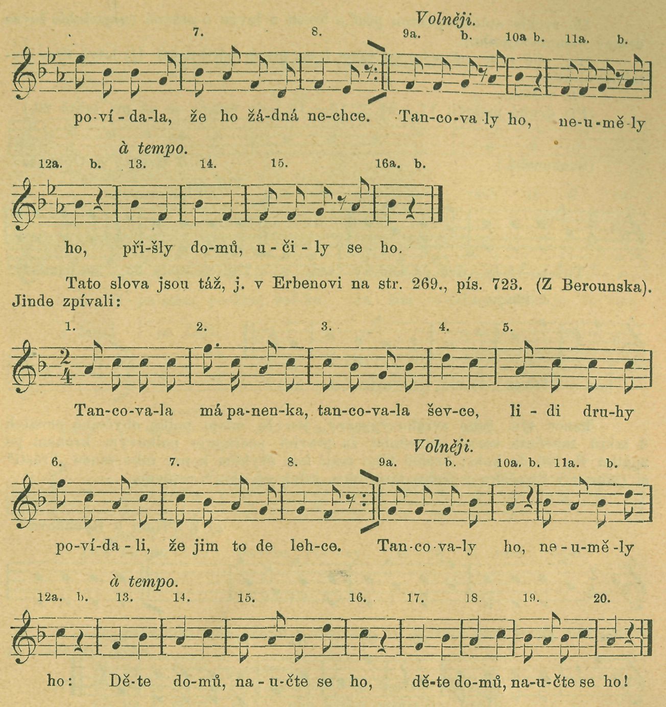 Při opakování 8. takt se zastaví a obě tanečnice nebo tanečník s tanečnicí) pokleknou na levá kolena (ale netřeba dokleknouti!) proti sobe. 9a. na pravé kolono levou pěsť, na ni pravou, b. vespod pravou, navrch levou, 10a. vespod levou, navrch pravou,
