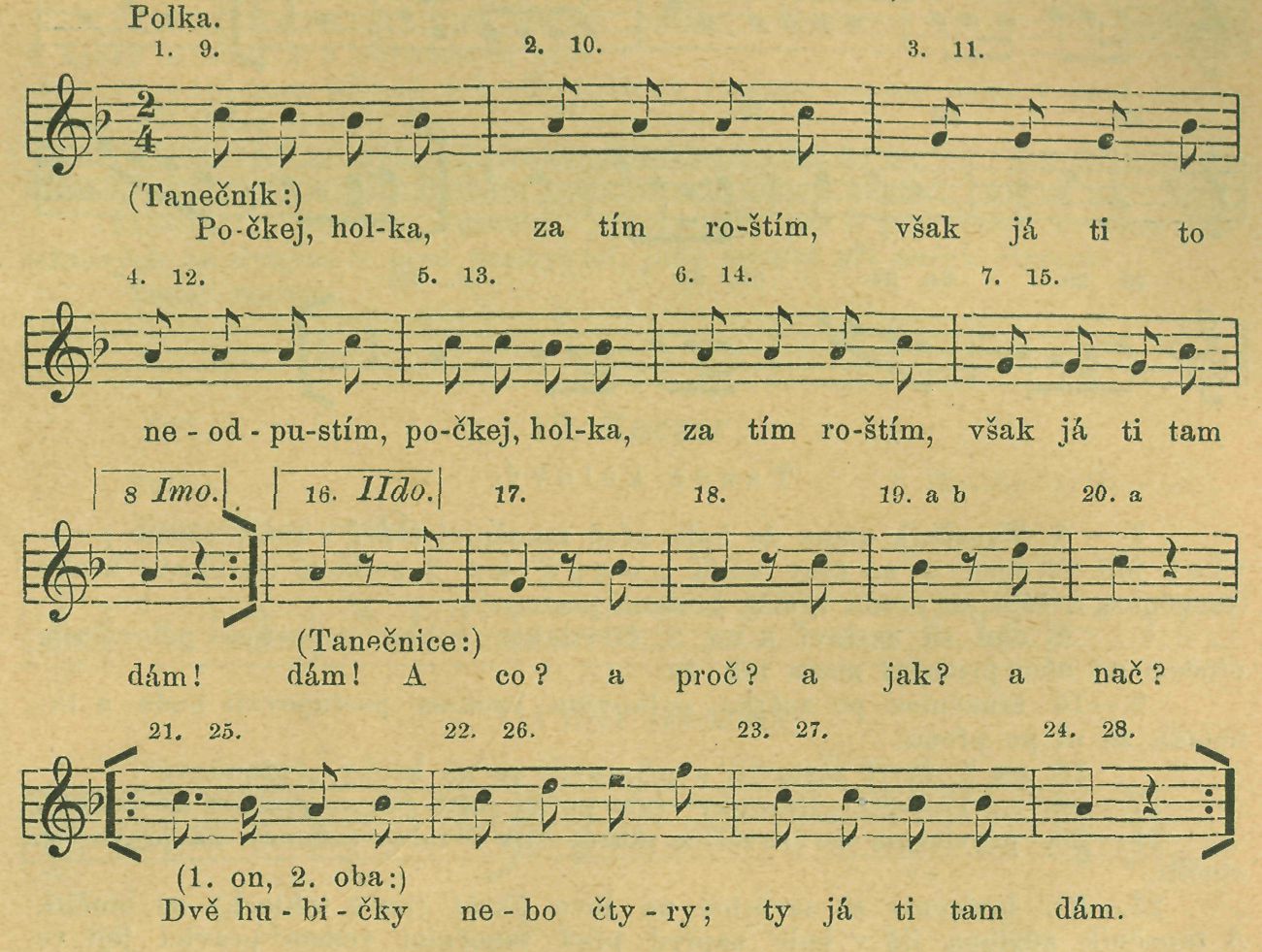 1.—15. tanečník s tanečnicí podadouoe si křížem ruce tančí takto stále se otáčejíce polku,