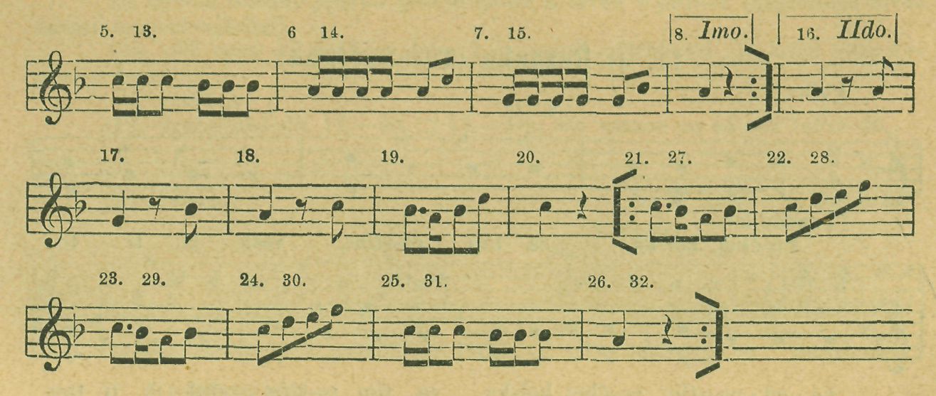 27.—32. levieema se zavěsíce na levo 3krát (po 2 taktech) se otočiti. A tanečník zůstana již v kole napřed před tanečnicí vezme pravici její ve svou a tanec počne znova.
