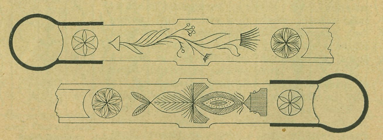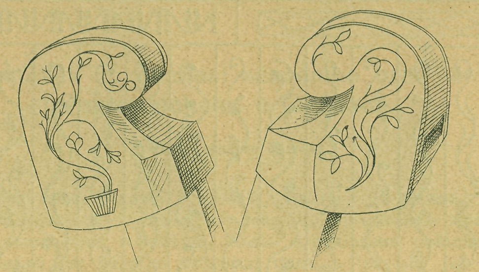 Na výrobcích kolářem pracovaných nevyskytují se plochy široké; shledáváme se tu nejvíce s ornamenty páskovými. Jimi ozdobeny jsou hlavně špice kol, voj, ramena její, stoličky, drábec, podýžď, sklem a p. Základním jejím tvarem bývá vlnovka, jejíž vlny, ruzně jsouce zdobeny, napodobují tvar rostlinný, který často vyrůstá z hrnečků, ze srdce, někdy i jiných základů. Ukázky seřadil jsem na obrázku '2. a 3., podotýkaje k tomu, že sebrány jsou po okrese humpoleckém a z Táborská. Místo vlnovky tvoří oblouk různě seřaděný jiný ornament páskový na pracích kolářských (obr. 3.). Často bývají různé motivy sloučeny v ozdobu velmi ušlechtilou. Kde přece naskytují se koláři plochy širší, není v rozpacích, jak je vyzdobiti. Aspoň mistru, který zdobil hlavice „dědka" (vlka), podařilo se to s nevšedním zdarem. Rostlinný tento tvar, vinoucí se na jedné straně z květináče,