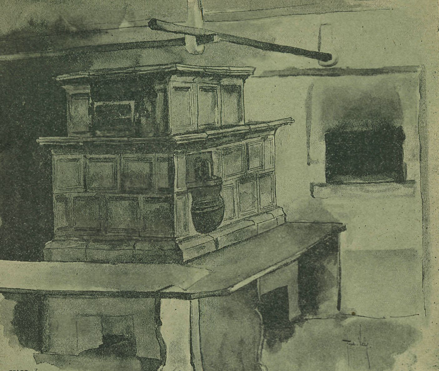 Čís. 1. Sence. Pohled na roh s kamny a krbem. Kresba akad. malíře Ferd. V e 1 c e.