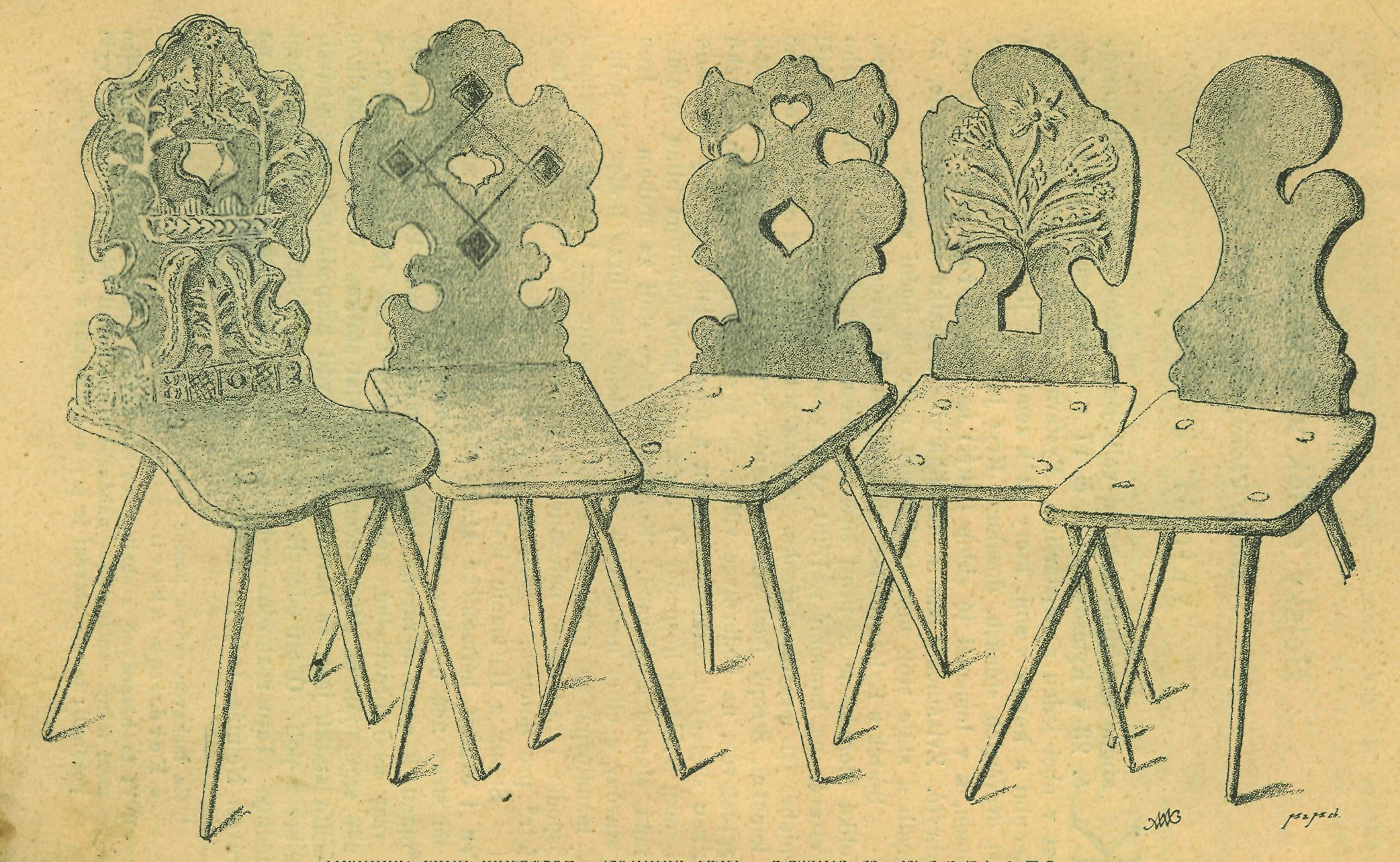 Ozdobné židle moravské. Skupina třetí. Kreslila M. Wanklojv.a.